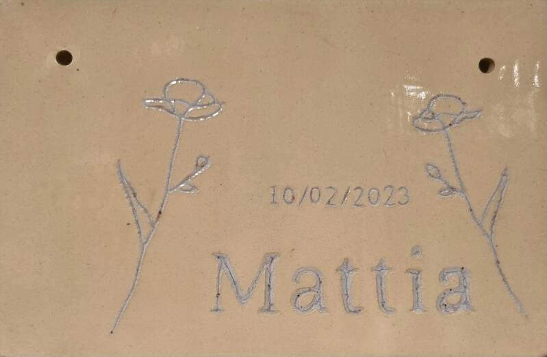 Een naambordje met geboortedatum voor de geboorte van Mattia